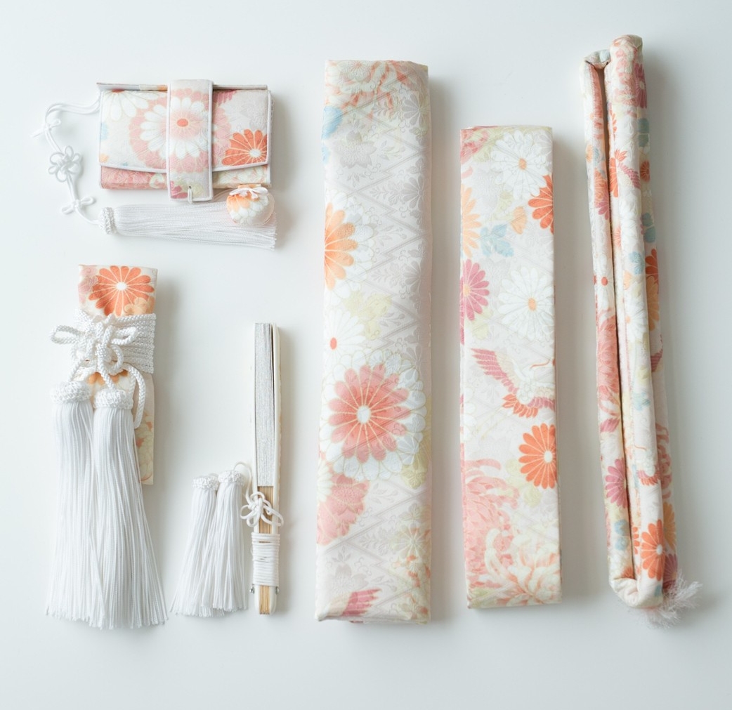 紅を薄めたような、淡いピンク色。 花を入れた菱紋の地模様に鶴と菊を合わせた柄ゆき。