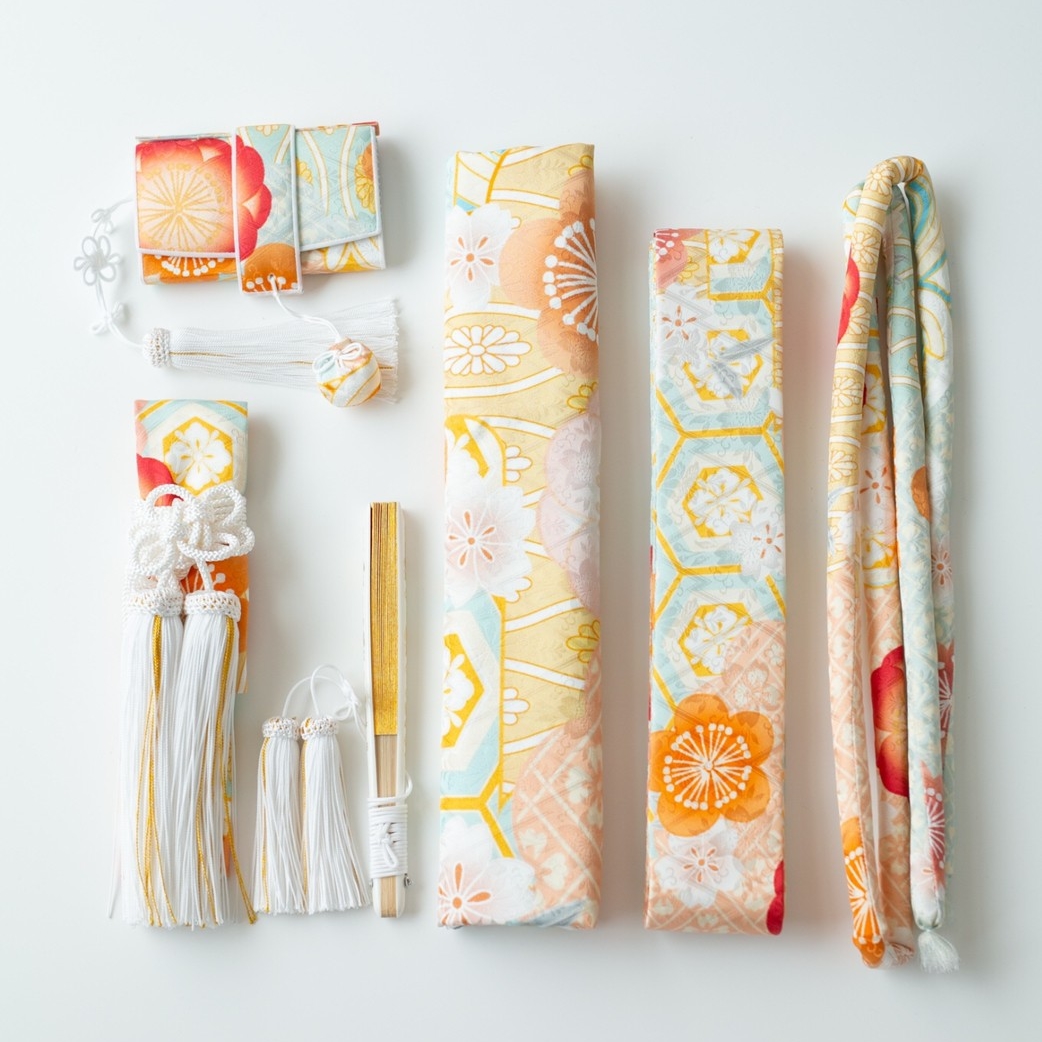 澄んだ水のような淡い青色。 菱紋の地紋様に、青海波紋と山吹色の梅の柄ゆき。