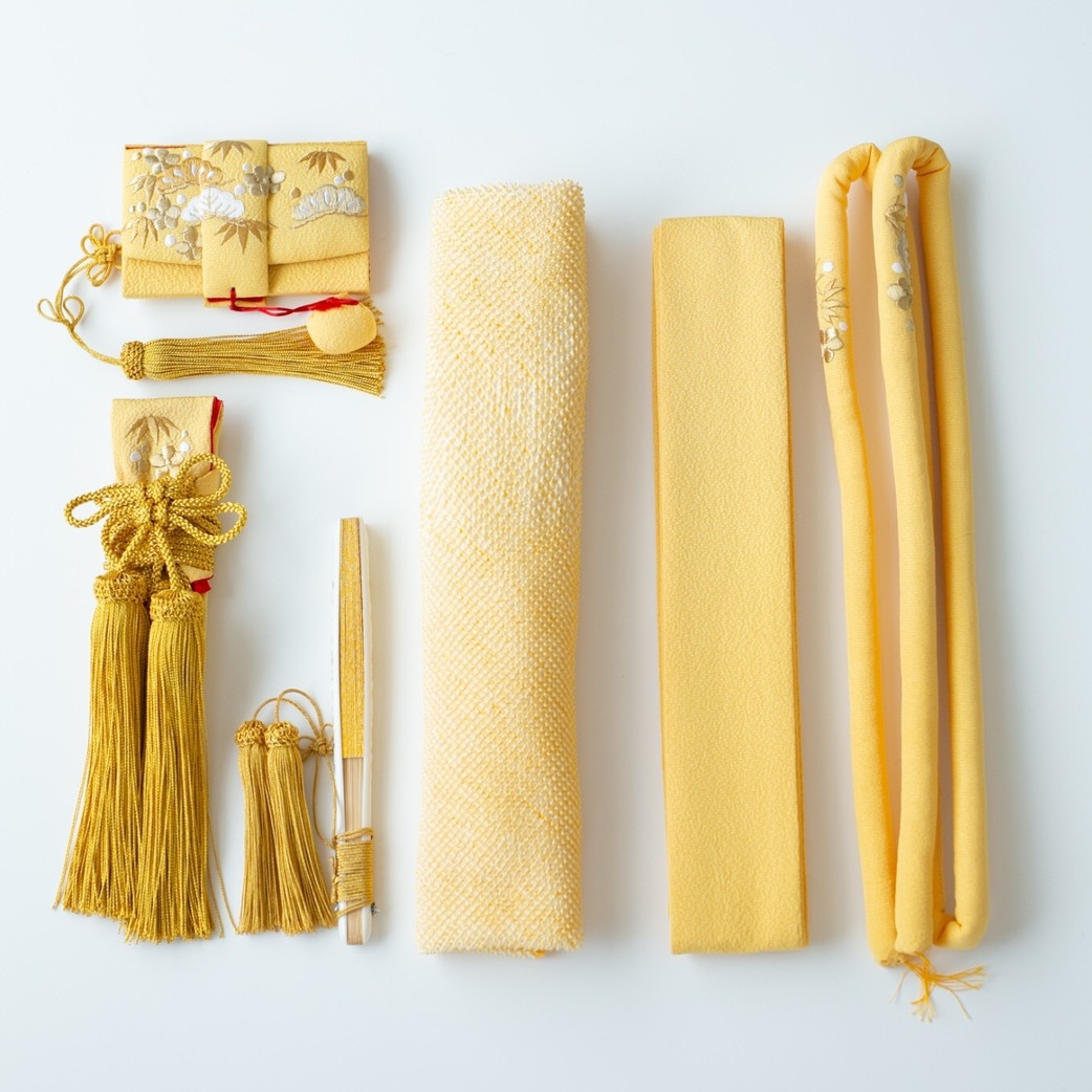 山吹の花のような鮮やかな橙。 松竹梅の吉祥の刺繍をあしらって。