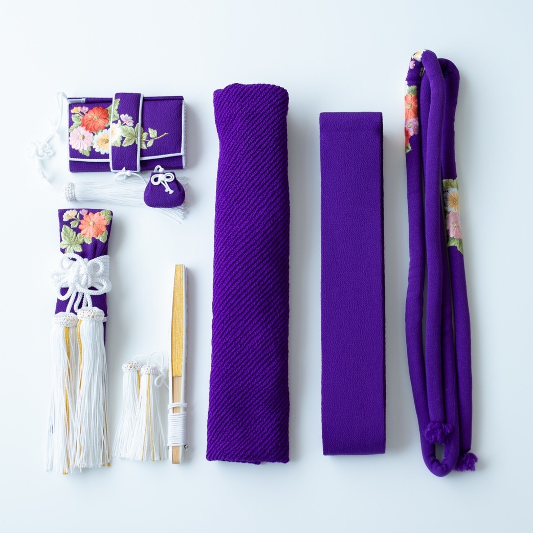 少し赤みのある紫色。 菊の花の刺繍は、三色の色合い。