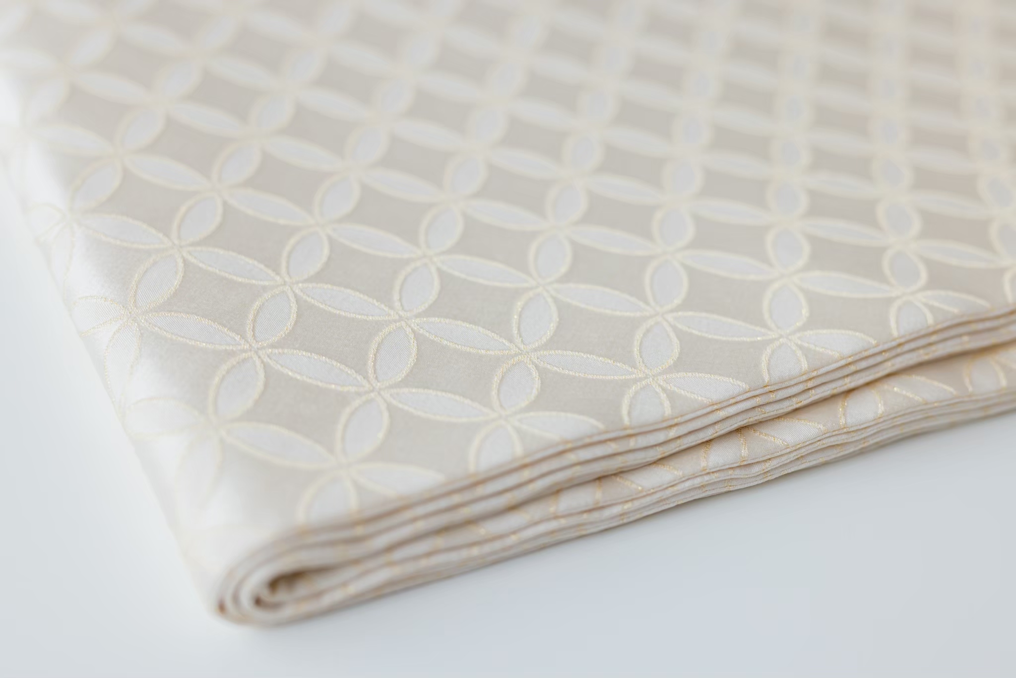 七宝柄がゴールドのラメで繊細に施されており、やさしさの中に上品な華やかさを併せ持ったデザイン