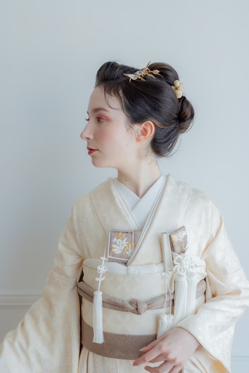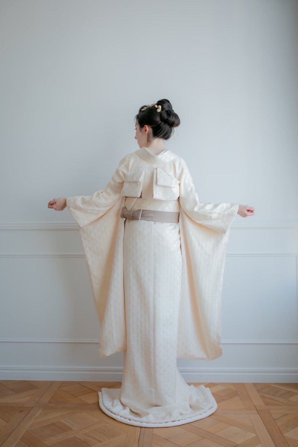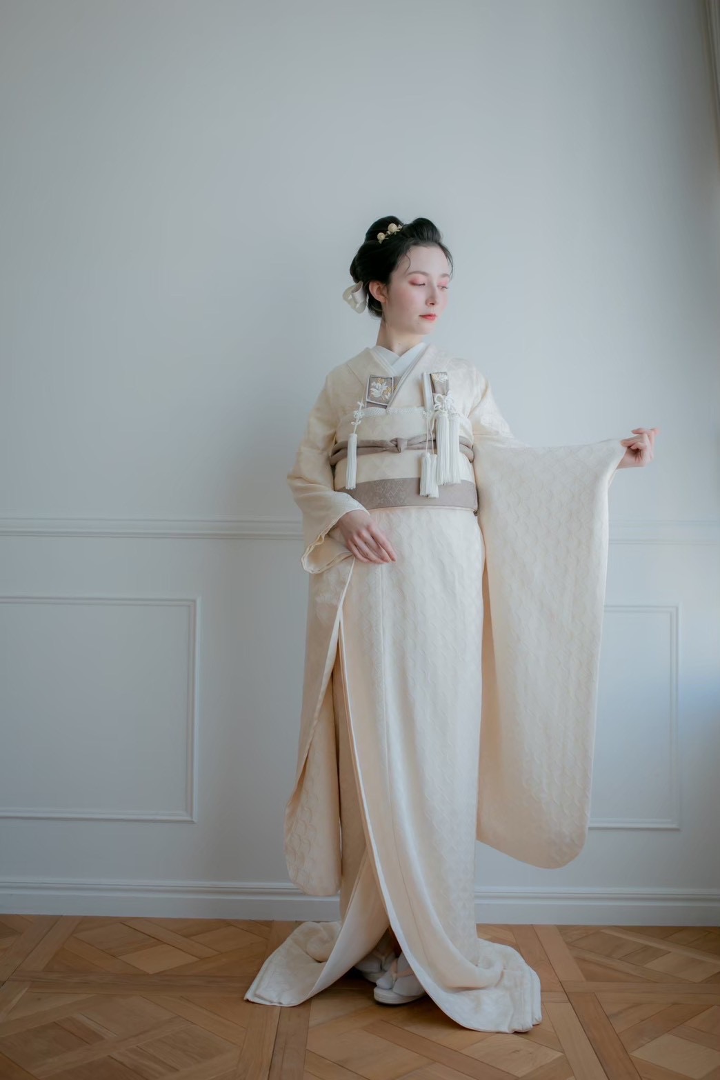 上質なクリーム色をベースにゴールドの七宝柄をあしらった一着